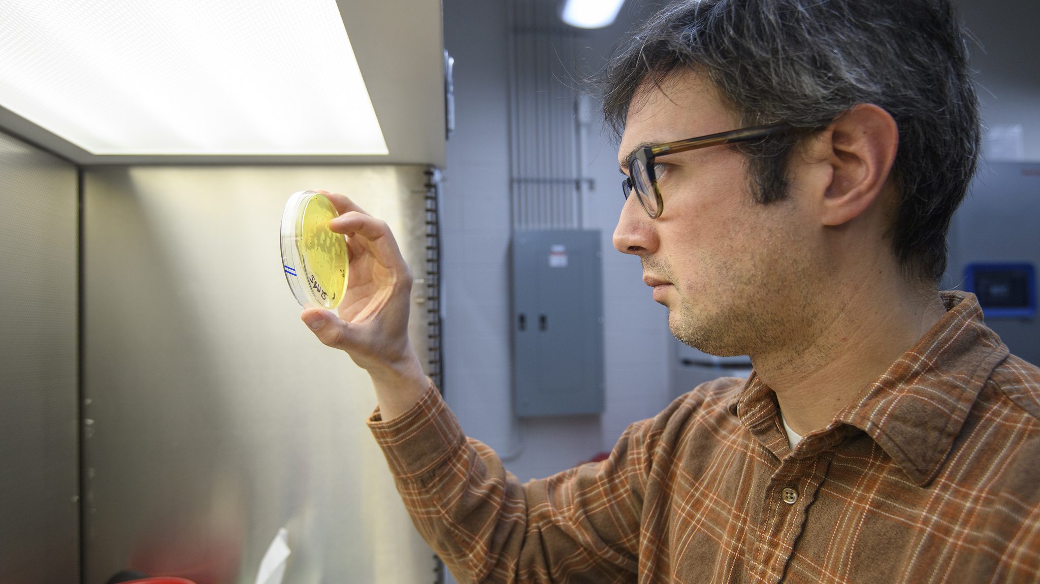 Biology professor Peter Zee examines microbial samples collected on agar plates in his lab in Shoemaker Hall. Photo by Thomas Graning/Ole Miss Digital Imaging Services