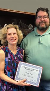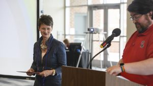 Robin Street, senior lecturer in journalism, is presented with the Vicki Mahan Ally of the Year Award by Kevin Cozart, operations coordinator at the Sarah Isom Center for Women and Gender Studies. Photo by Scott Fien
