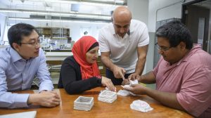 UM mechanical engineering professor Shan Jiang (left), civil engineering professor Hunain Alkhateb, and chemical engineering professors Sasan Nouranian and Alexander Lopez discuss research plans for ultraviolet 3D-printed binders that could be mixed with Martian soil. The technique could provide a breakthrough in construction methods for exploring other planets. Photo by Thomas Graning/Ole Miss Digital Imaging
