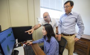 UM chemical engineering professor Sasan Nouranian (standing, left), mechanical engineering professor Shan Jiang and master’s student Jungmin Jeon (seated) investigate molecular simulations for In-Space Sintering Mechanisms, a high-tech method of turning loose material into usable solids for construction. Photo by Thomas Graning/Ole Miss Digital Imaging Services