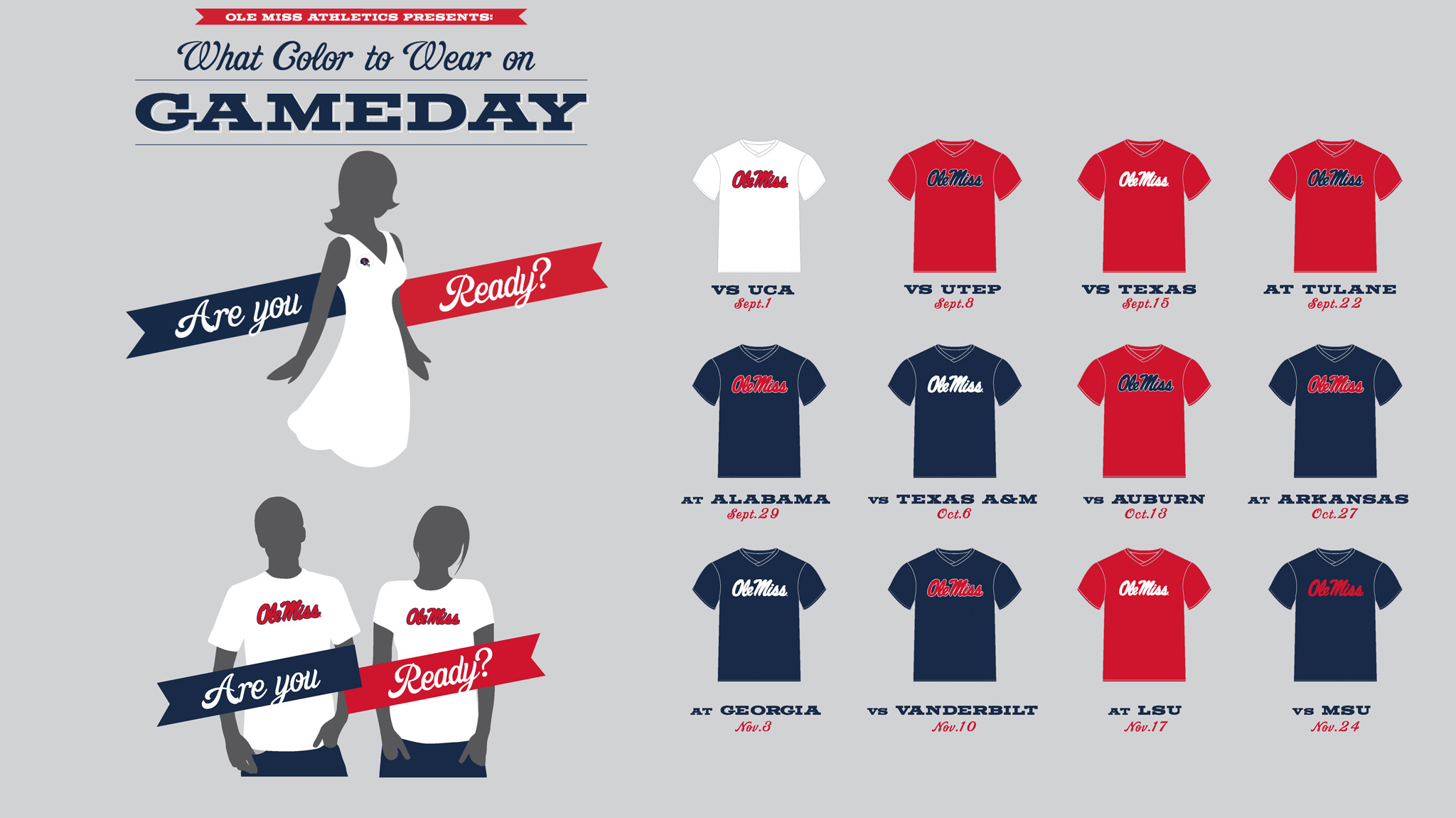While Rebel Nation is encouraged to wear white for the Central Arkansas game on Sept. 1, the preferred color for other home games is red for UTEP, Texas and Auburn, while navy is the color of choice for Texas A&M, Vanderbilt and MSU.