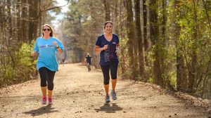 Jekabsons and colleague Jessica Hughes jog on the South Campus Rail Trail. Photo by Robert Jordan/Ole Miss Communications