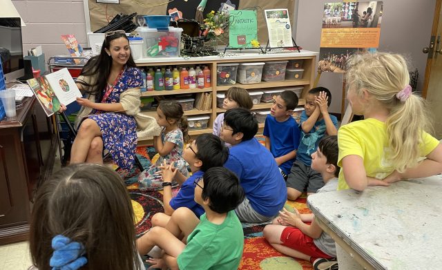 Rosa Salas Gonzalez (left), museum educator at the University of Mississippi Museum, reads to students during the recent Fantastic Storytellers camp, in which children grades 1-5 learned how to tell and illustrate a compelling story. The museum is offering several more camps throughout the summer. Submitted photo