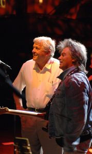 UM Chancellor Emeritus Robert Khayat (left) visits with country music star Marty Stuart onstage at the Ford Center during rehearsals for Stuart’s 2007 concert at the venue. Photo by Robert Jordan/Ole Miss Digital Imaging Services