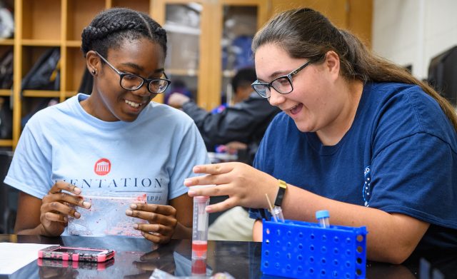 Biology lab partners Chinwe Udemgba (left) and Ashley Adams screen a mixture of strawberry and detergent into a tube to extract the strawberry DNA in an Ole Miss lab. Photo by Robert Jordan/Ole Miss Digital Imaging Services