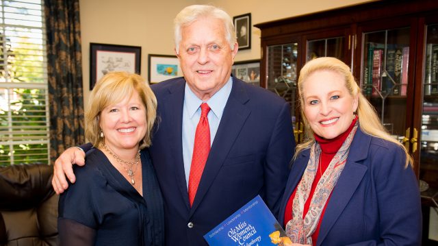Chancellor Emeritus Robert Khayat (center) spends time with Ole Miss Women’s Council for Philanthropy members Karen Moore (left) and Mary Donnelly Haskell. Khayat is set to discuss his new book, ’60: A Year of Sports, Race & Politics,’ on ‘Thacker Mountain Radio Hour’ at 6 p.m. Thursday (Nov. 18) as part of the new Robert C. Khayat Lecture Series, which was founded this year by the OMWC. Photo by Bill Dabney/UM Foundation
