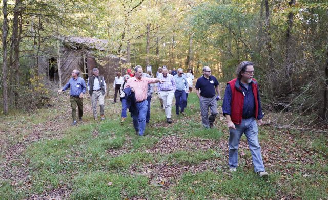 A group of UM alumni and friends explores the land where the Greenfield Farm Writers Residency will be constructed. The Julia Reed Kitchen will be part of the gathering pavilion, where participating writers will go for their daily meals. Photo by Kirsten Simpson/University Development
