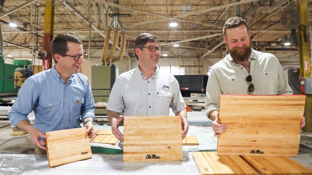Scotsman Co. founders (from left) Josh Nowell, Jim Rasberry and Ben Napier take a look at Ole Miss-branded serving boards the company is selling to establish a scholarship endowment for students in the university’s Center for Manufacturing Excellence. Photo courtesy Scotsman Co.