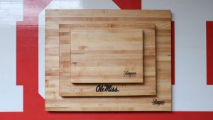 The Ole Miss-branded serving boards are crafted from wood salvaged from an old athletics court on campus. The sales will help endow a scholarship for Mississippi students in the university’s Center for Manufacturing Excellence. Photo courtesy Scotsman Co.