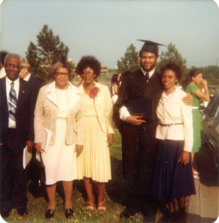 Edwin Smith (far right) with his fiance’ Fannie Jenkins and members of his family near the Grove on graduation day in May, 1980.