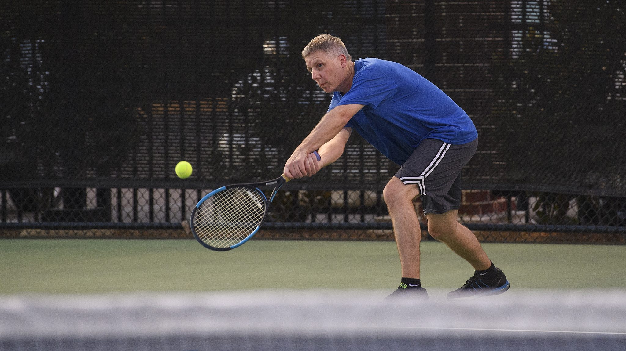 Paris Buchanan, associate director of marketing/fan experience for the Department of Intercollegiate Athletics, has played tennis since he was child. A state champion in junior high and high school competitions, he finds playing singles gives more ability to be in control.