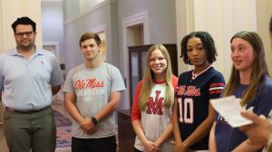 Giving Day participants also earned some interesting experiences. Five Ole Miss students – Eriona Banks, Anderson DeWitt, Casey McCarthy, Marshall St. Amant and Margaret Walker – gained an opportunity to join more than 100 years of students before them and sign the turret inside Ventress Hall. Students who contributed gifts to the College of Liberal Arts were chosen randomly to join Dean Lee Cohen in signing the wall.