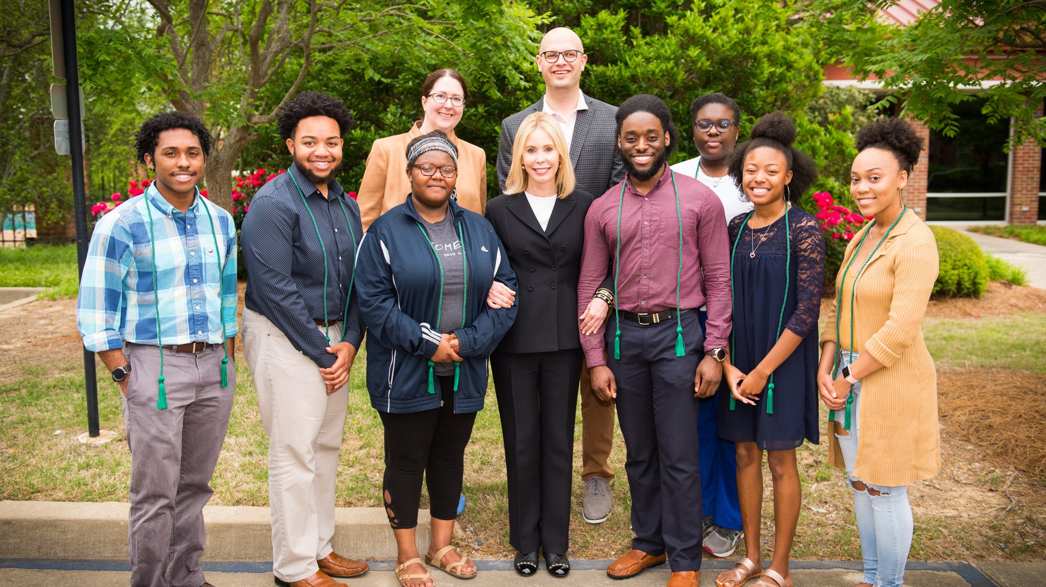 Renvy Pittman (front, center) enjoys spending time with the Grove Scholars whenever she visits campus. Here, she visits with alumni of the program: 2018 seniors (front, from left) Jontae Warren, Devante Yates, Jessica Cole, Rashad Collier, Deshauntra Green, Bre O’Neal and Myrical Taylor; and (back, from left) Maura Scully Murry, director of the FASTrack Learning Community, and E. Gray Flora IV, director of Grove Scholars and FASTrack senior academic mentor. Photo by Bill Dabney/UM Foundation