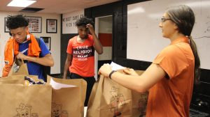 UM master’s student Rebeca Henry (right) distributes supplemental nutrition bags to high school football players at Calhoun City High School during the Fueling Fitness intervention featured in her 3MT research. Photo by Sarah Sapp/School of Applied Sciences