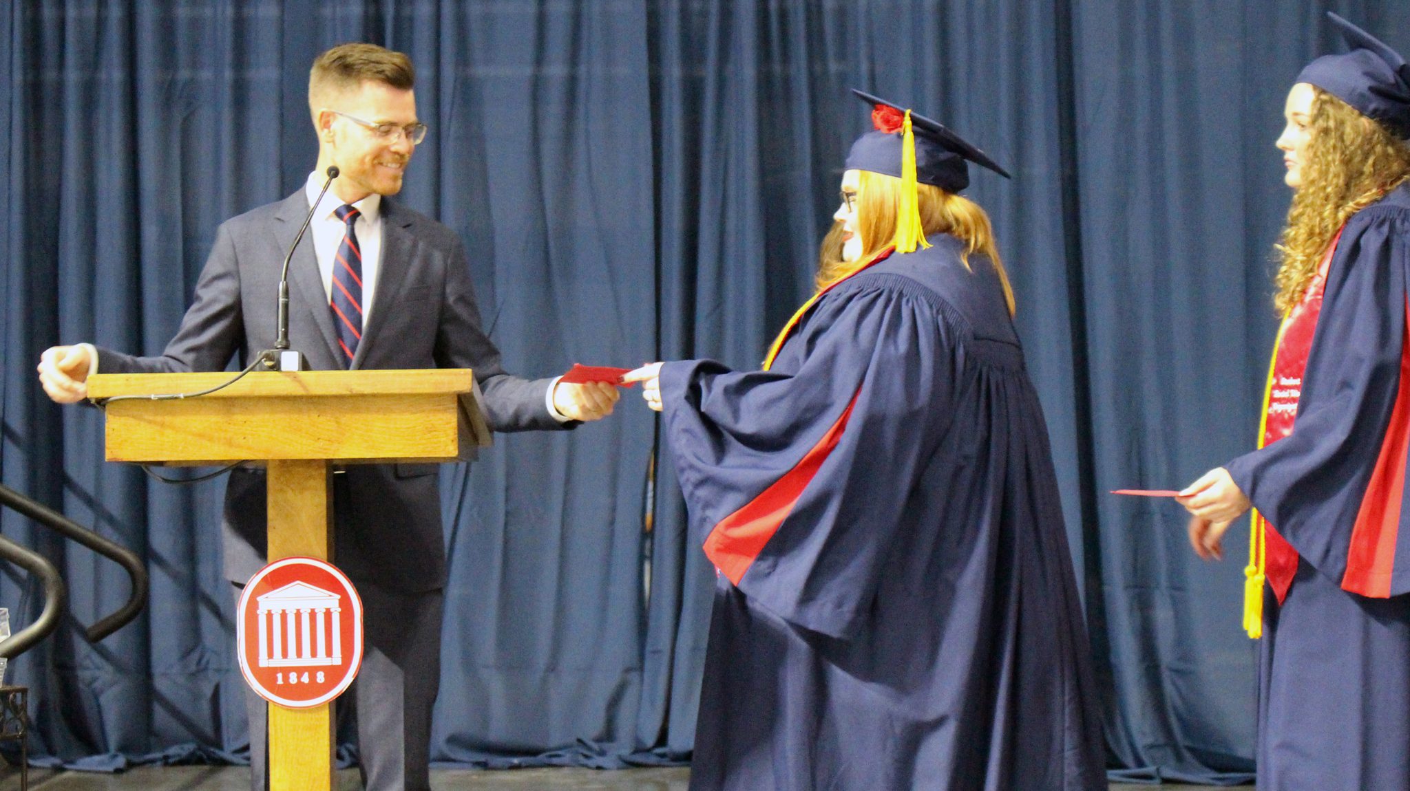 Drew Lefmann (left), UM coordinator of advising, recruitment and retention for the Department of Social Work, announces Mikala Turner’s name as she is granted her bachelor’s degree Saturday (May 11) at graduation ceremonies for the School of Applied Sciences. Photo by Sarah Sapp/School of Applied Sciences