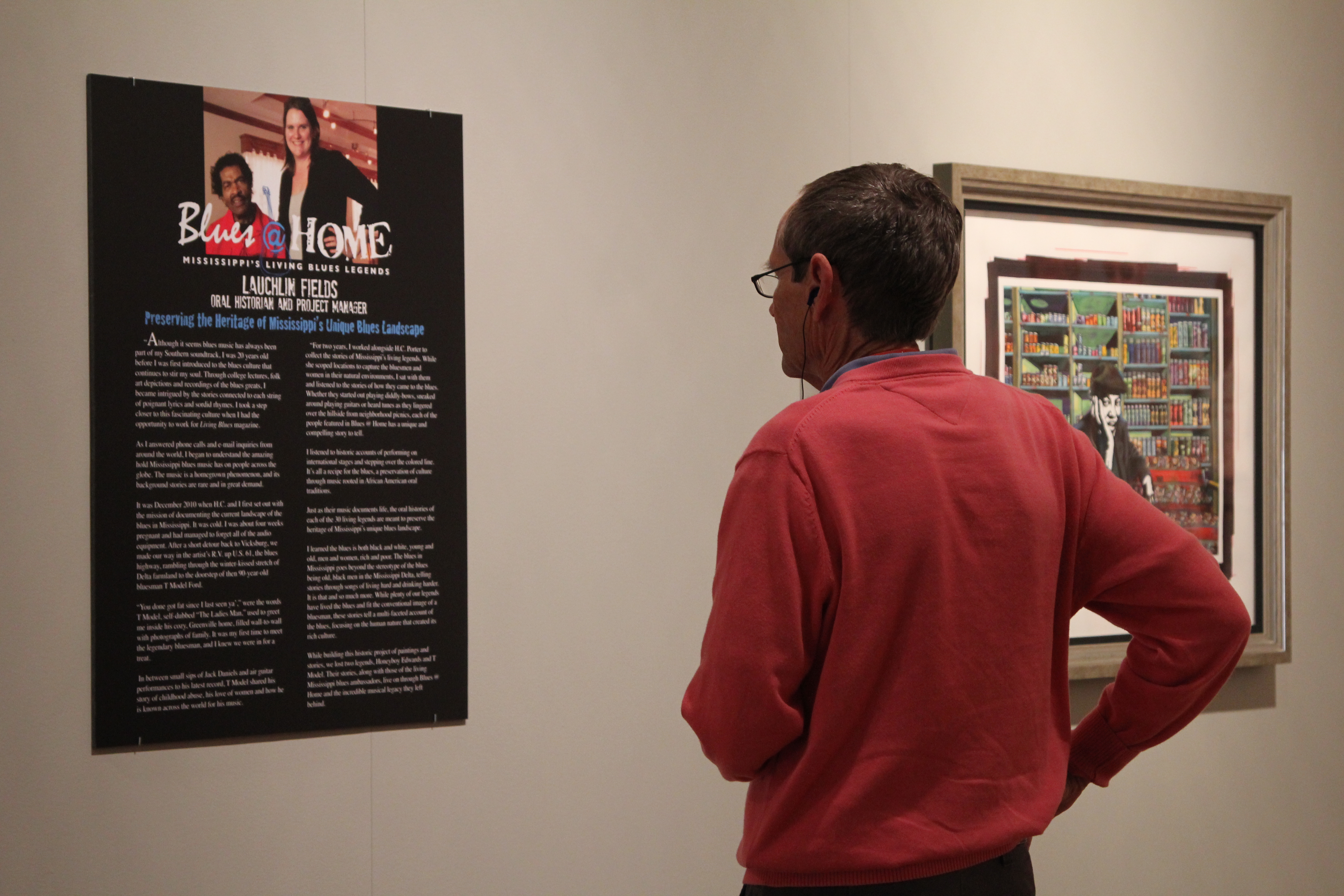 A University Museum visitor soaks in the sights and sounds of the Blues @ Home exhibit. H.C. Porter’s work is on display through Aug. 2.