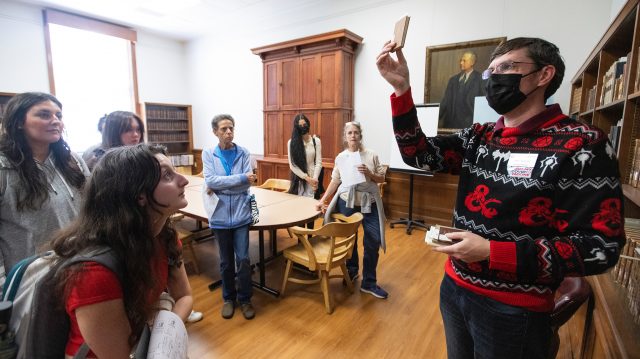 Librarian Alex Watson (right) shows a Hidden Library Tour group a micro-book, a tiny bound copy of hymns and prayers that once was used in church services. The book is part of the collection in the Harrison Room of the J.D. Williams Library. Photo by Thomas Graning/Ole Miss Digital Imaging Services