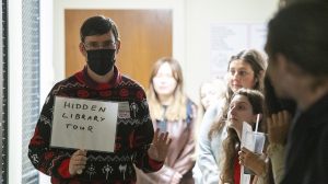 A crowd of more than a dozen students, professors and university staff members crowded in the front entrance of the library on a recent Wednesday afternoon to see Alex Watson, librarian and conductor of The Hidden Library Tour.