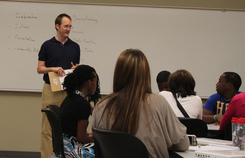 Mississippi Teacher Corps program manager Ben Guest meets with Wide Angle Learning participants during a photography workshop at the University of Mississippi. Photo by Sharon Levine.