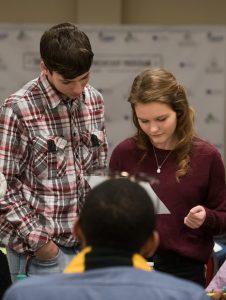 Itawamba County High School students Chase Ross (left) and Raina Ratliff discuss the best way to pitch their group’s idea for a coffee shop. Photo by Megan Wolfe/Ole Miss Digital Imaging Services