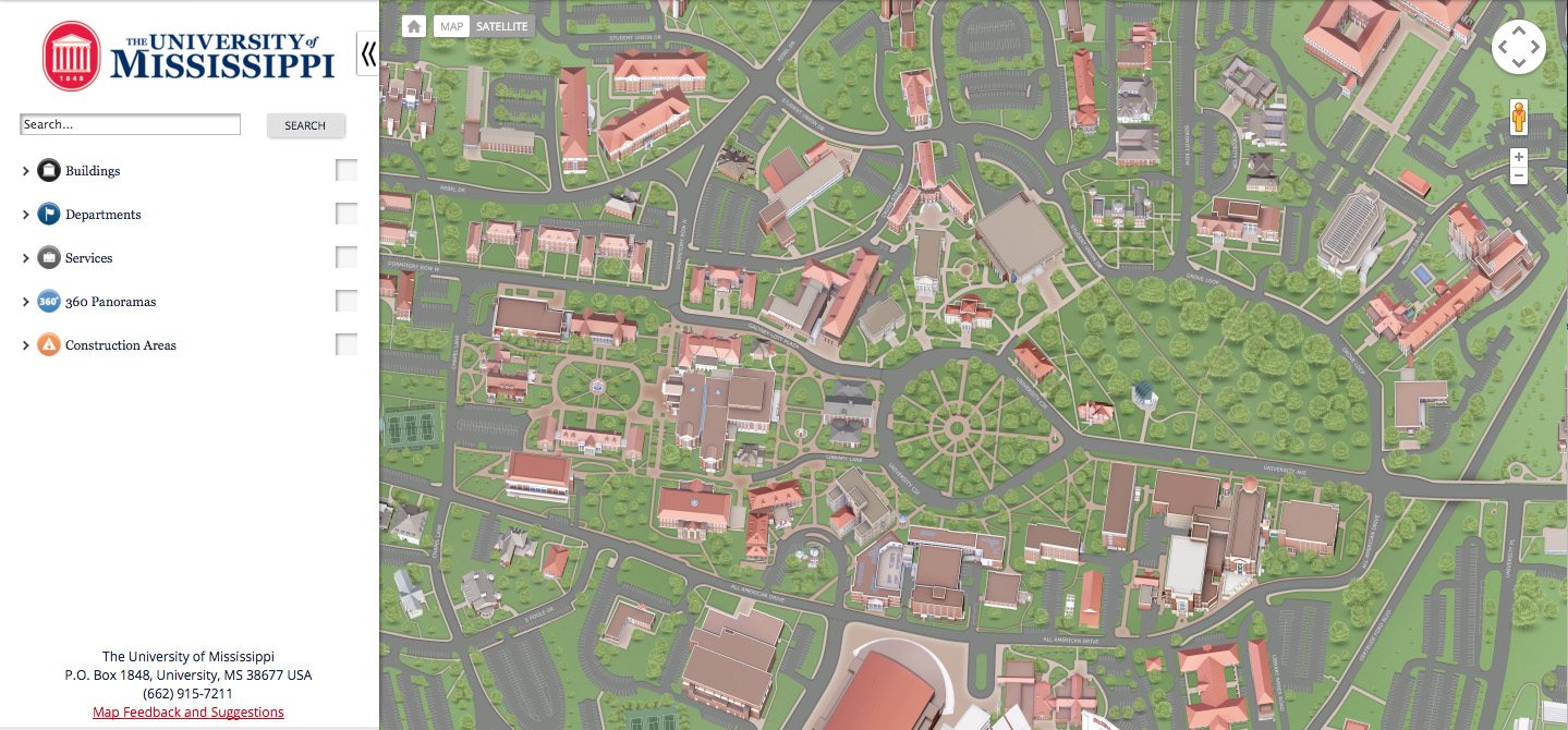 As we get further into the holiday season and closer to spring events, such as Commencement, that will bring many visitors to campus, take a moment to become reacquainted with the Ole Miss campus map. Featuring custom media, 2-D overlays and 360-degree panoramic street views, our map allows users not only to zoom and pan around to find buildings, but also to see bus routes, accessibility information, food courts and ATMS as well as up-to-date parking and construction news. New moms can even find lactation spaces on campus!