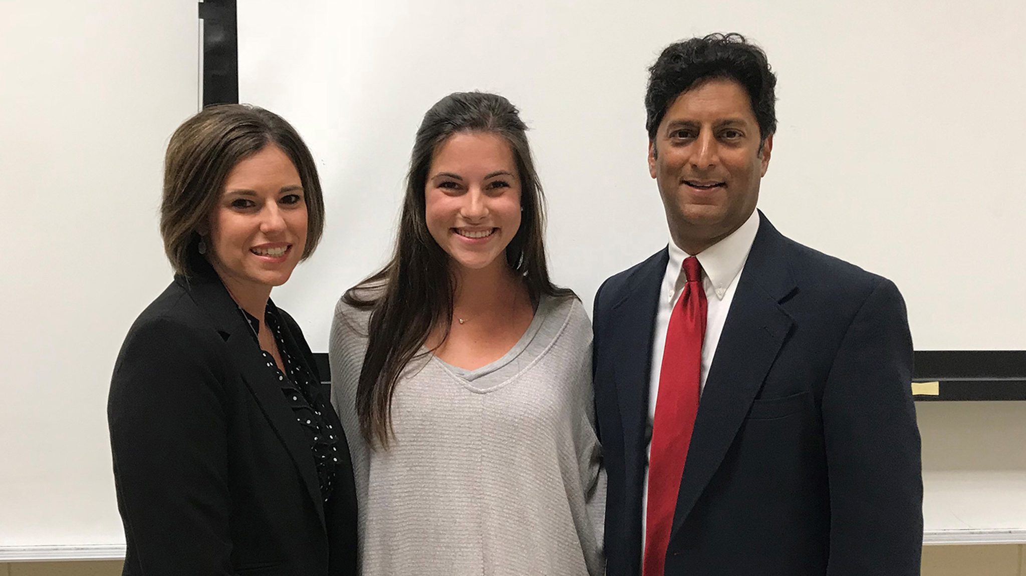 Shelley Walker (left), Chawla Hotels vice president of emerging brands and innovation, and Suresh Chawla (right), company president, chat with with UM student Madeleine Coleman during their campus visit to discuss internship and employment opportunities with the company’s two new hotels in the Mississippi Delta. Submitted photo