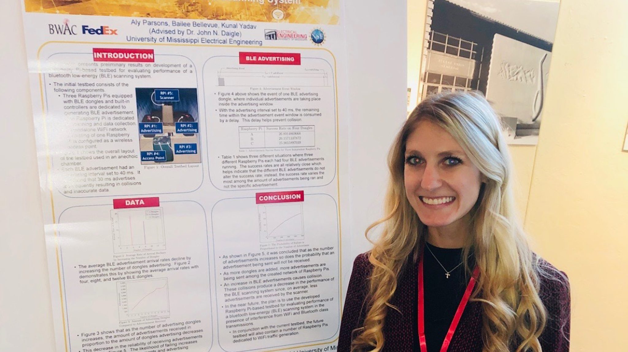 Aly Parsons, a participant in professor John Daigle’s research group, stands in front of the BLE analysis poster she presented at the Broadband Wireless Access and Applications Center in Tucson, Arizona, last fall. Submitted photo