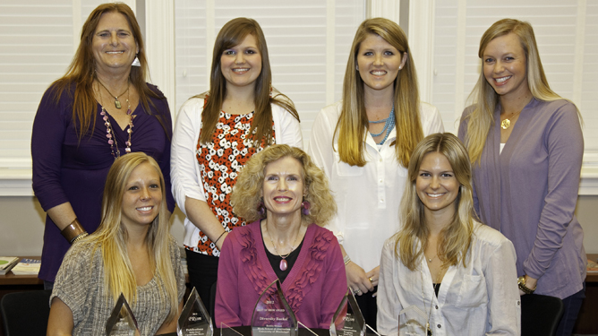 Among the winners of 2012 PRism Awards are (front row, left) Casey Rains of Pinckneyville, Ill., UM journalism instructor Robin Street, Caitlin Adams of Columbia, Mo., and (back row) UM videographer Mykki Newton, Kristie Warino of Kiln, Caroline Coulter of St. Louis and Ashley Lance of Franklin, Tenn. Photo by Stan O'Dell.