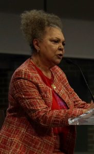 The speaker related “blasts from the past,” citing African American figures such as Katherine Johnson, a mathematician who helped NASA win the race to the moon; abolitionist Sojourner Truth; Shirley Chisholm, both the first African American congresswoman and female presidential candidate; musicians Nina Simone and Big Mama Thornton; Claudette Colvin, a pre-Rosa Parks bus rider who championed desegregation of public transportation; Mary Fields, the first African American postal worker; and the Rev. Richard Allen, founder of the African Methodist Episcopal Church.