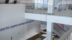 The South Campus Recreation Center is a 100,000-square-foot facility that features a 6,000-square-foot functional training zone, an indoor climbing wall, 25,000 square feet of fitness space, three fitness studios, two basketball courts, a multiactivity court, walking/jogging track, classroom with a demonstration kitchen and a convenience store.