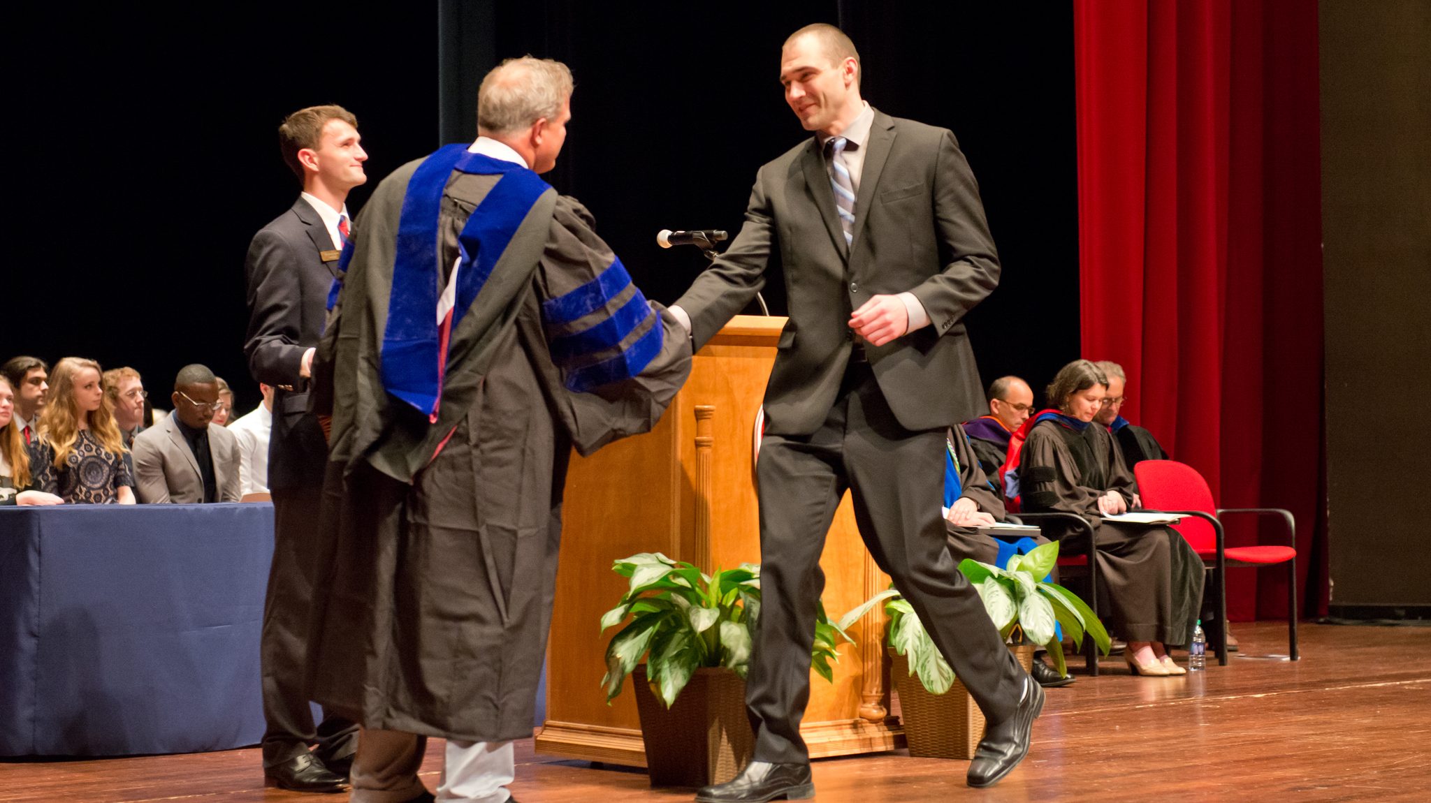 Peter Grandjean, (center) dean of the UM School of Applied Sciences, presents the J. Robert Blackburn Graduate Award in Exercise Science to Scott Dankel at the university’s Honors and Awards Convocation on April 4. Photo by Bill Dabney/UM Foundation