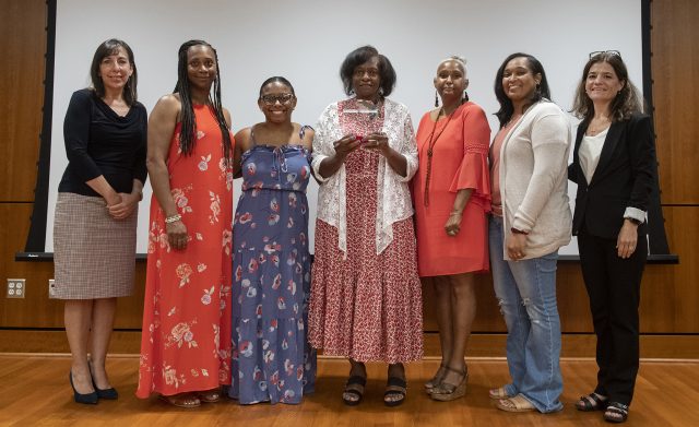 Laura Antonow (left), UM director of college programs, and Ginny Chavis (right), professor of art and interim associate provost, present the 2021 University of Mississippi Outstanding Internship Experience Partner of the Year to the family of Oscar Pope. They are (from second-to-left) Renada Ragsdale and Chelsea Dees, both of Richland; Beverly Pope, Oscar’s mother, and Earnestine Mayes, both of Terry; and Shannon Lewis, of Richland. Photo by Logan Kirkland/ Ole Miss Digital Imaging Services
