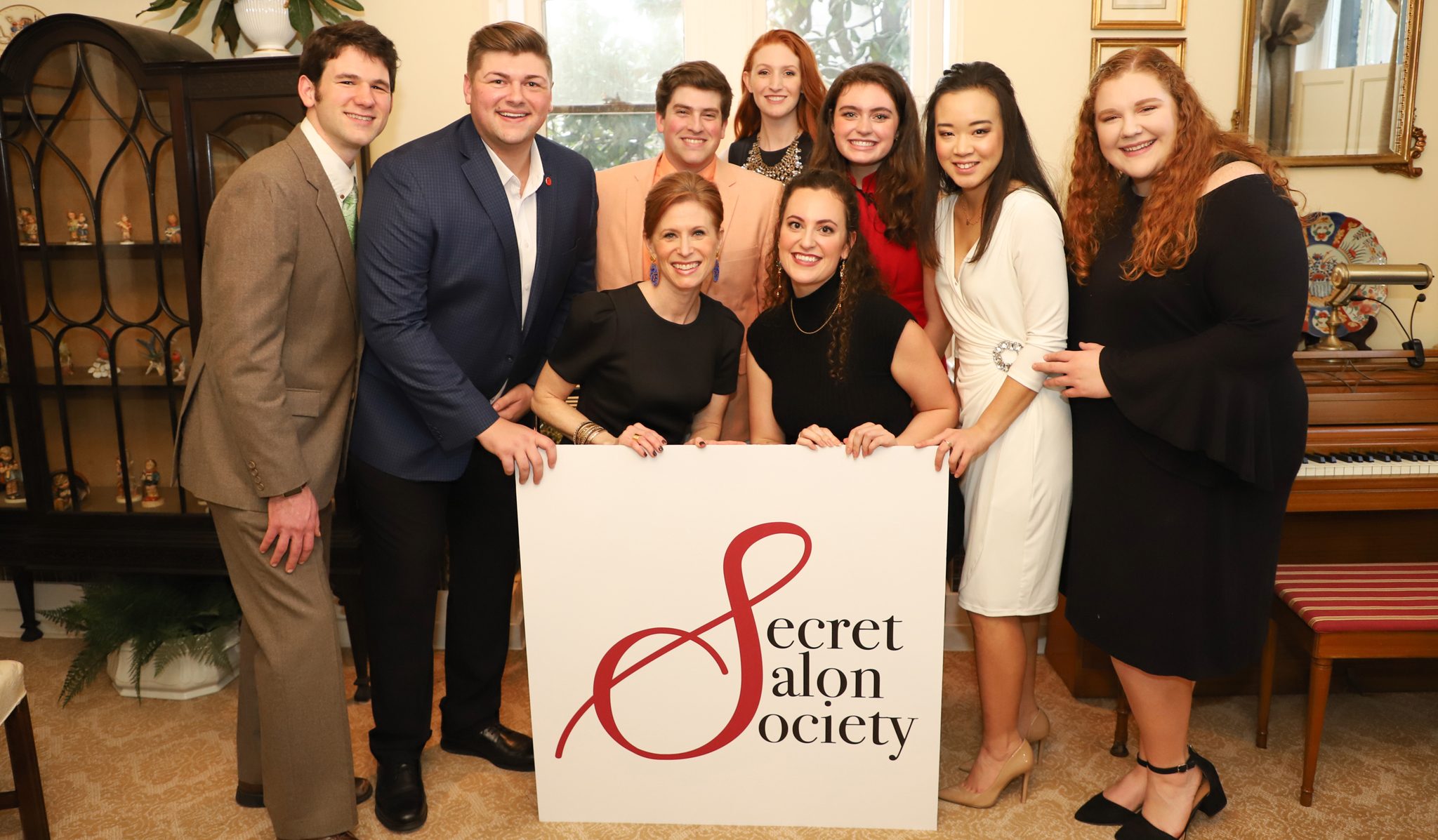 Among those attending the recent launch of the Secret Salon Society logo are (front row, from left) Nancy Maria Balach, CEO/artistic director for Living Music Resource and interim chair of the UM Department of Music; and Korynn Lacher, a master’s student in vocal performance from Richland, Washington; and (back row, from left) Benjamin Rorabaugh, master’s student in vocal performance, of Long Beach; Brady Bramlett, executive managing director for LMR and associate director of annual giving; Reagan Arnold, a senior music education major from Collins; Ava Street, a bachelor’s student in music education, of Purvis; Alexis Rose, a bachelor’s student in vocal performance from Omaha, Nebraska; Jiwon Lee, master’s student in education and performance, of Oxford; and Lilly Swilley, bachelor’s student in music education from New Albany. Photo by Kirsten Faulkner/UM Development
