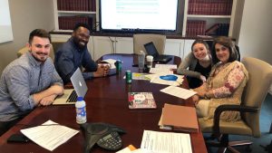 Archive Photo: UM doctoral student Taylor Sanders (left), professor Ovuokerie Addoh, Honors student Rachael Larkin and Lexington Mayor Robin McCrory collaborate on the Healthy Hometown Award application, which the city was awarded in July 2019. Submitted photo