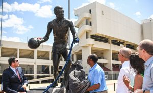 Keith Carter (left), vice chancellor for intercollegiate athletics, and Ole Miss Rebel basketball trailblazer Coolidge Ball unveil a statue of Ball during a 2021 dedication outside The Sandy and John Black Pavilion at Ole Miss. The statue project was funded by Bill and Lee Anne Fry, who have designated part of a new $2.5 million gift to benefit Ole Miss athletics. Photo by Josh McCoy/Department of Intercollegiate Athletics
