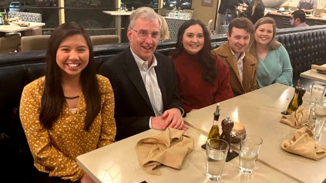Donor Doug MacEachern (second from left) enjoys a dinner with UM pharmacy scholars (from left) Amy Ly-Ha, Lindsey Miller, Nason Wise and Emily Harrell. Photo by Sally Rychlak/UM Development