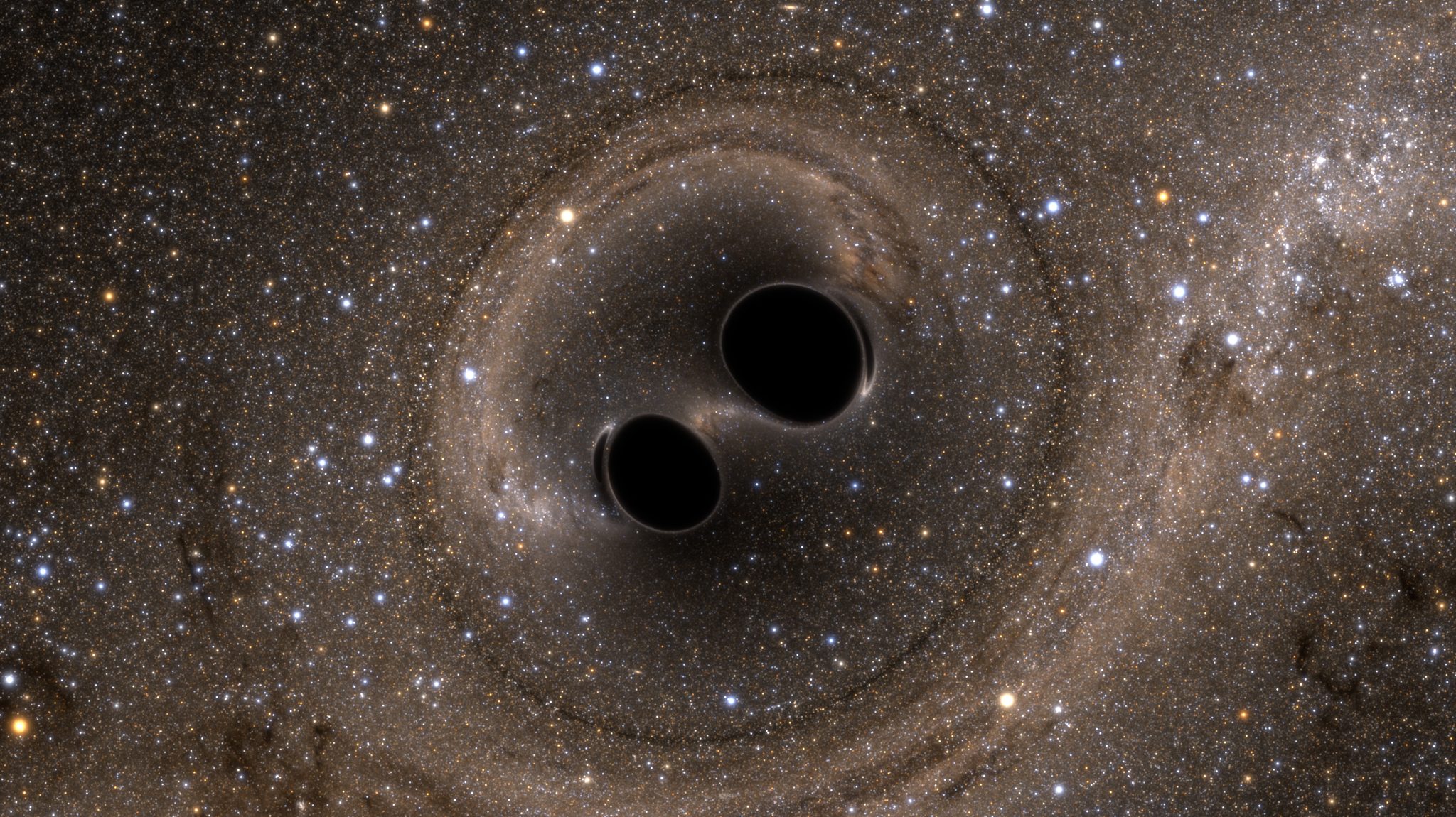 This simulation depicts two merging black holes, each about 30 solar masses. This is approximately what a person would see if they could travel in spaceship to take a closer look at merging black holes. Graphic courtesy the Simulating eXtreme Spacetimes project