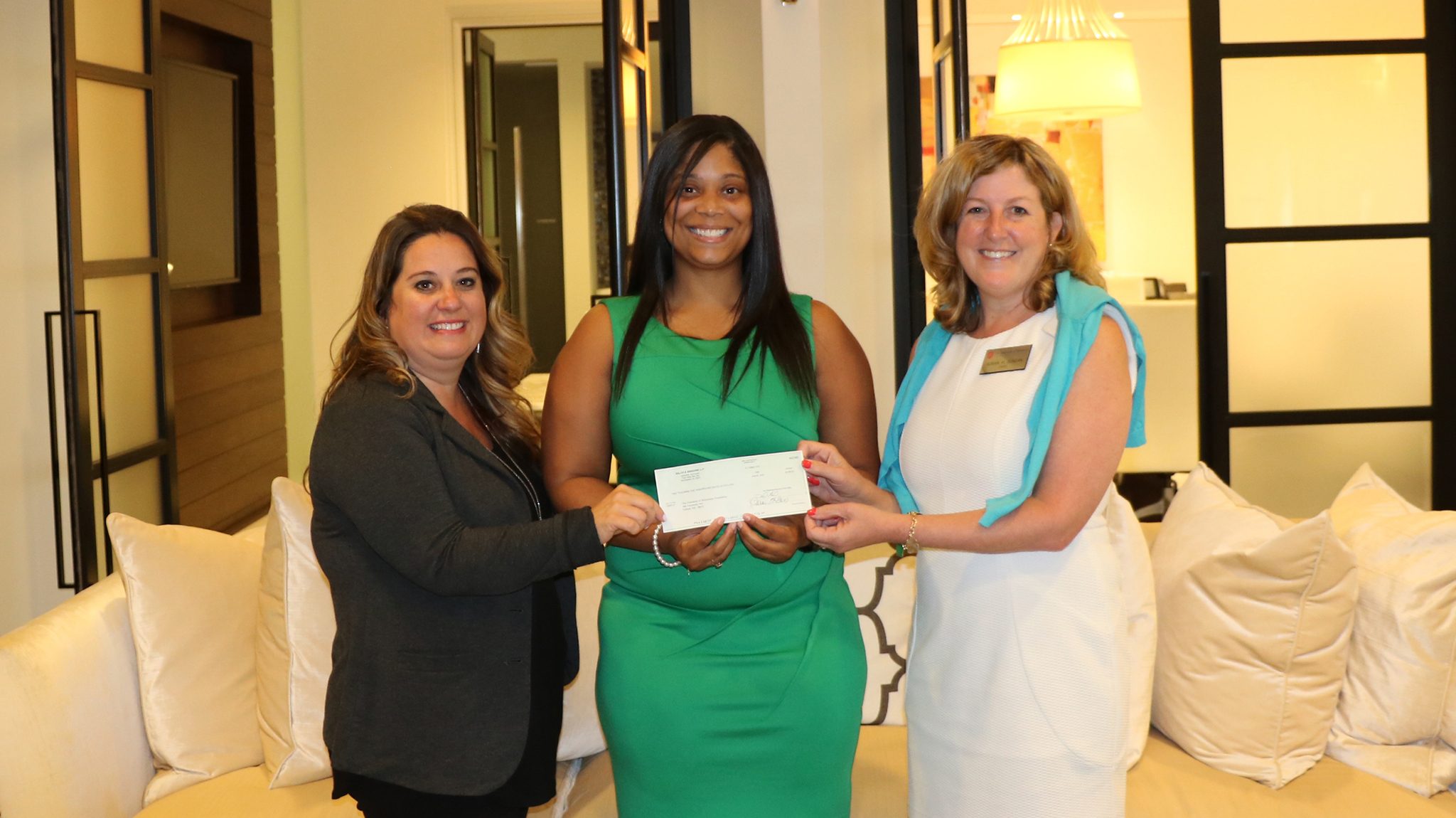 Tara Ellis (left), managing partner of Balch and Bingham, and UM law Dean Susan Duncan (right) congratulate Kye Handy, the first recipient of the Medgar Evers scholarship. Photo by Suzette Matthews/University Development