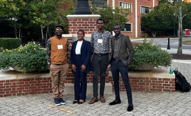 Martial Longla (left), associate professor of mathematics, and three Ole Miss doctoral students – Kanchana Madhumali Gamlat Esweda Gamladdalage, Mathias Muia and Mous-Abou Hamadou – attend a three-day American Mathematics Society sectional meeting in Chattanooga in October. Submitted photo