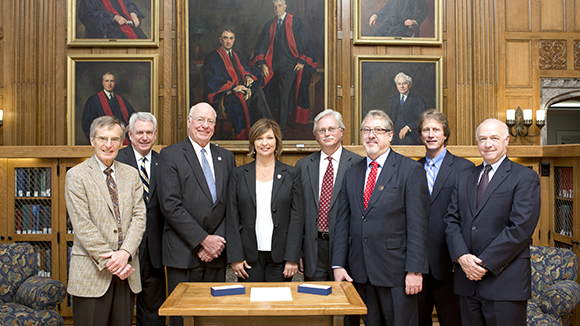 Representatives of the University of Mississippi Medical Center and the Mayo Clinic on Tuesday signed an agreement to broaden and deepen their collaboration in clinical trials, other medical research, and education. Taking part in the signing at the Mayo Clinic in Rochester, Minnesota were (from left) Dr. Robert Rizza, Mayo Clinic liaison for the collaboration; Dr. Dan Jones, University of Mississippi chancellor; Dr. James Keeton, UMMC vice chancellor for health affairs and dean of the School of Medicine; Dr. LouAnn Woodward, UMMC associate vice chancellor for health affairs and vice dean of the School of Medicine; Dr. Richard Summers, UMMC associate vice chancellor for research; Dr. Gregory Gores, Mayo Clinic executive dean for research; Scott Kaese, Mayo Clinic operations administrator for research; and Steven C. Smith, Mayo Clinic chairman of the Department of Research Administration.