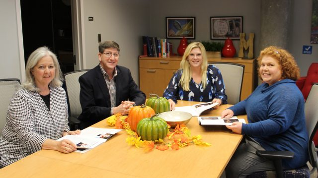 Lila Neely (left) works with Walter Davis, faculty director of MBA programs; Ashley McGee, director of administration of MBA programs; and Amy Johnson, records coordinator, at the School of Business Administration. Photo by Stella Connell/School of Business Administration