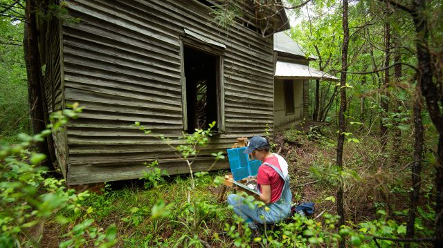 An Ole Miss art student paints a dilapidated structure at Greenfield Farms, where nine Mississippi artists will paint William Faulkner’s former mule farm as part of a competition benefitting the Greenfield Farm Writers Residency project. A public reception on Sept. 17 will allow guests to watch the painters complete their works. Photo by Kevin Bain/Ole Miss Digital Imaging Services