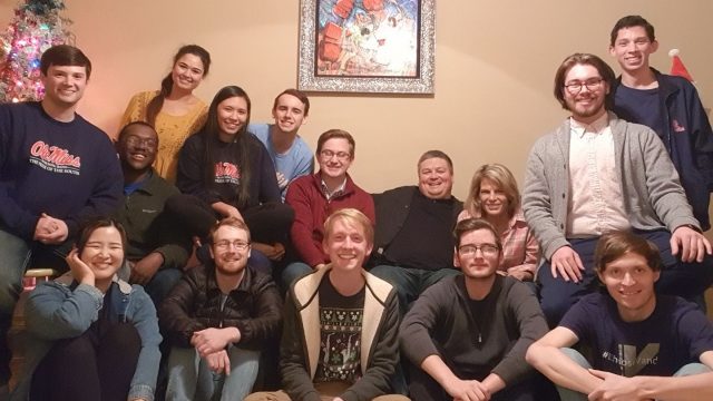 Adam Estes (back, right center) hosts a holiday dinner in 2019 for students in his saxophone studio. Submitted photo