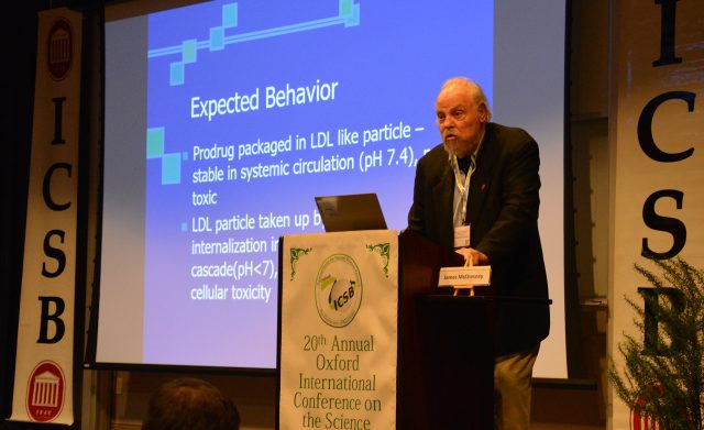 James McChesney, CEO of Cloaked Therapeutics LLC, discusses his company’s development of new drugs to target cancer cells during the inaugural McChesney Lecture at the 20th ICSB. Photo by Whitney Tarpy/UM School of Pharmacy
