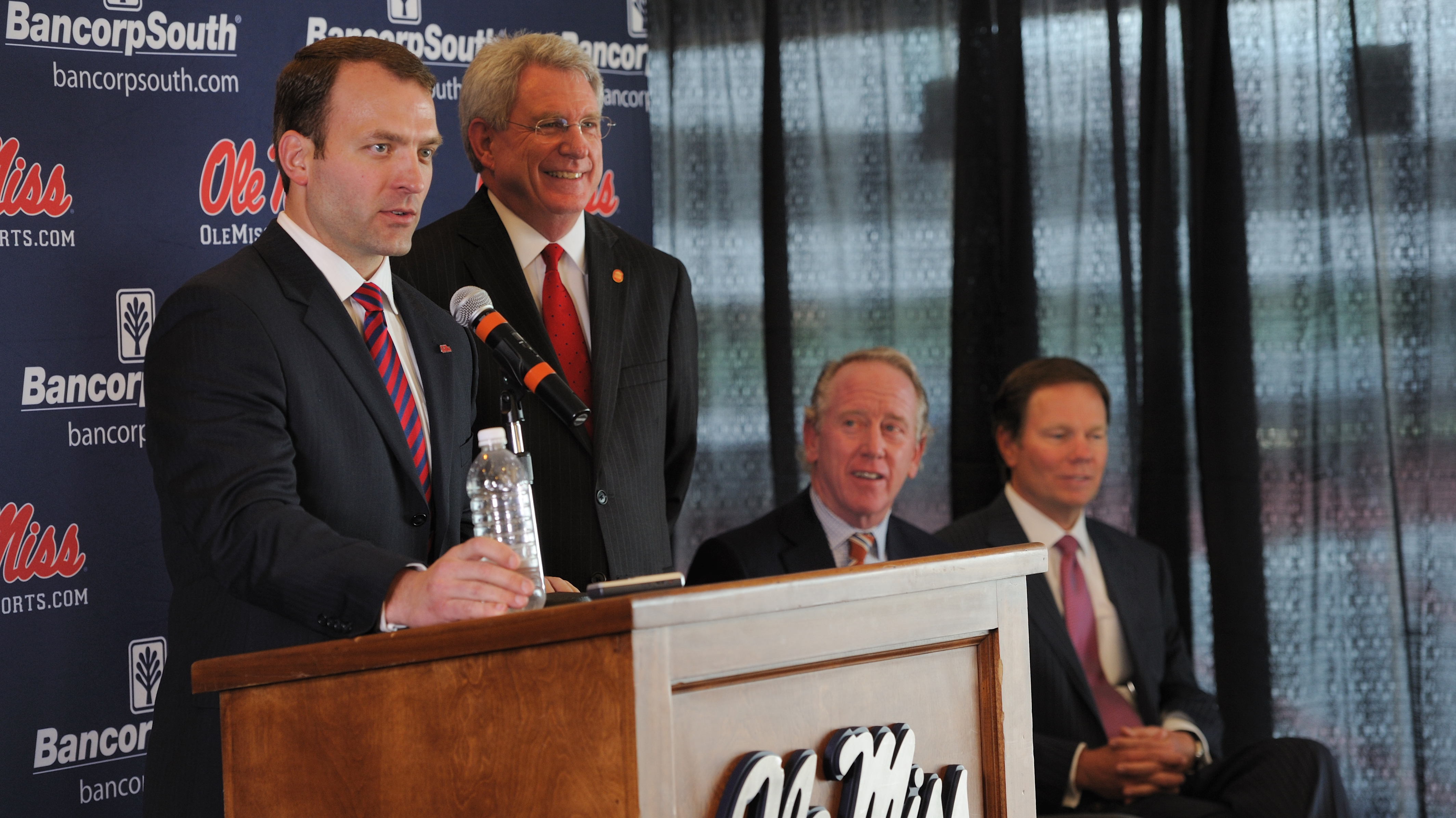 UM AD Ross Bjork, UM Chancellor Dan Jones, Archie Manning, and executive vice president of Market Development and Corporate Communications for FedEx Corp. Mike Glenn. Photo by UM Photographer Kevin Bain