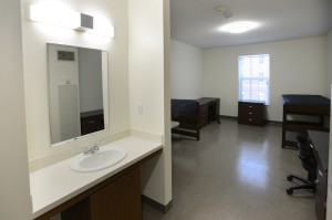All rooms in Ridge dorm are double suites, each with two desk, two dressers, two elevated beds, double closets, a sink and a private bathroom. UM photo by Robert Jordan.