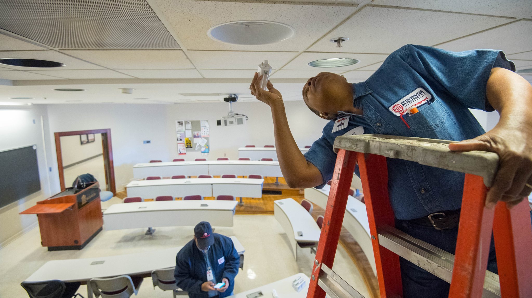 UM employee Gwen Hutchins (right) replaces an energy-saver light bulb inside a classroom in Bondurant Hall. Bulb replacements can help reduce electricity bills. Photo by Kevin Bain/Ole Miss Digital Imaging Services