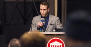 Garrett Felber, a UM assistant professor of history who spearheaded planning efforts for the ‘Black Power at Ole Miss’ events, reads the demands black students made of the university in 1970, most of which have been met, noting some still haven’t. Photo by Christian Johnson/ Ole Miss Digital Imaging Services