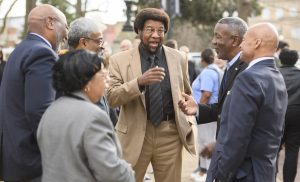 Kenneth Mayfield (center) catches up with classmates he was arrested with 50 years ago for protesting the university’s treatment of black students. Photo by Thomas Graning/Ole Miss Digital Imaging Services