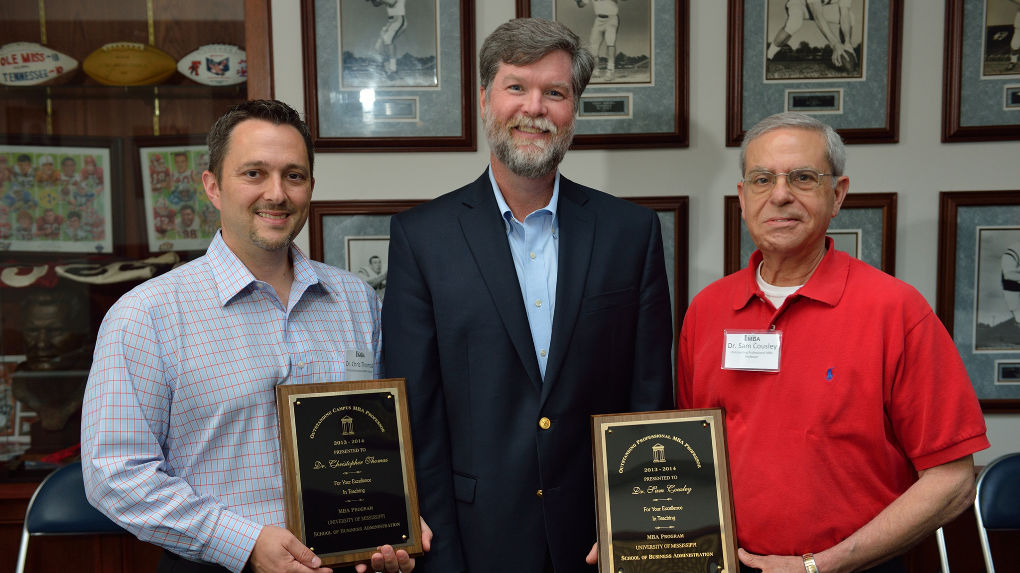 Christopher Thomas and Sam Cousley pictured with Dean Ken Cyree after receiving the Most Outstanding Faculty award.